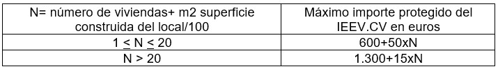 - El importe protegido del IEEV.CV será el coste facturado del informe (sin IVA) hasta un máximo subvencionable de acuerdo con el siguiente cuadro en función del número de viviendas del edificio y de la superficie del local del edificio, en su caso: